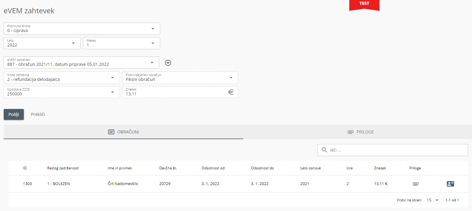 Pred pošiljanjem je mogoče podatke posamičnega obračuna pregledati in dodati priloge na posamični obračun ali celotni zahtevek (npr. potrdilo o krvodajalstvu). Na koncu se izvede pošiljanje zahtevka s klikom na gumb Pošlji.
