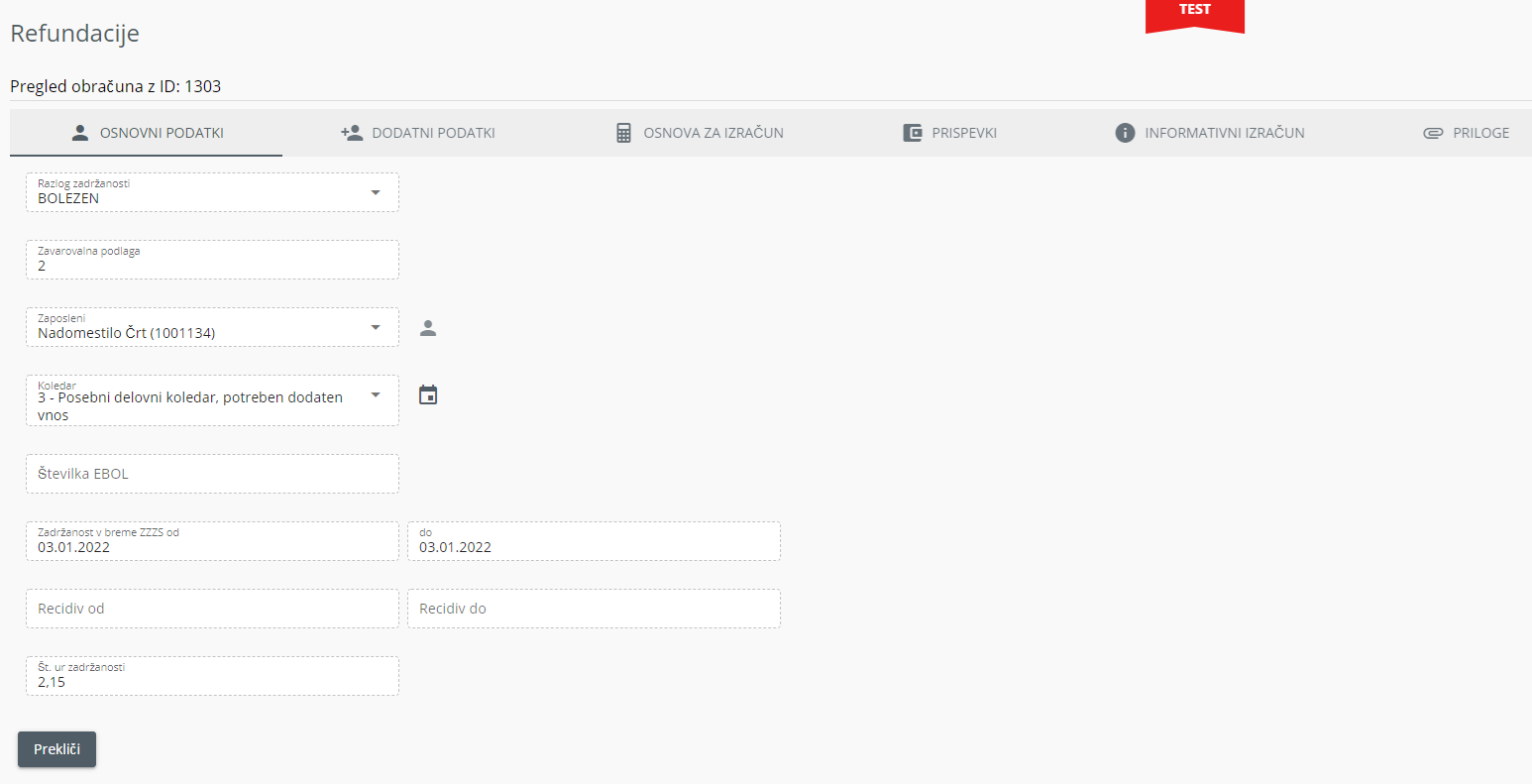 Ko je bolniški list prevzet, aplikacija omogoča pregled vseh ključnih podatkov, ki se napolnijo avtomatično. V redkih primerih (krajši delovni čas, posebni delovni koledar, 121. dan itd.) je potrebno pred pripravo zahtevka za refundacijo ustrezno urediti podatke na bolniškem listu.