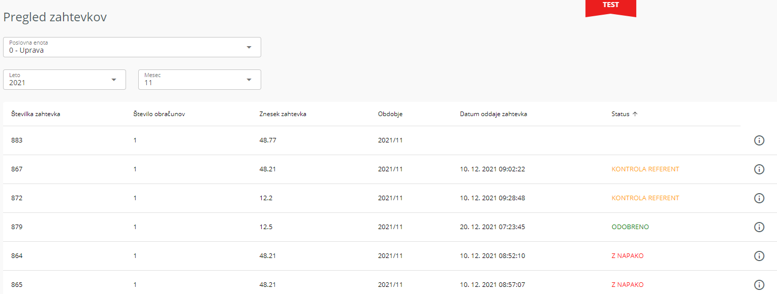 Ko je zahtevek poslan, je mogoče pregledovati stanje zahtevka na maski Pregled zahtevkov. Viden je trenutni status in morebitne napake zahtevka.